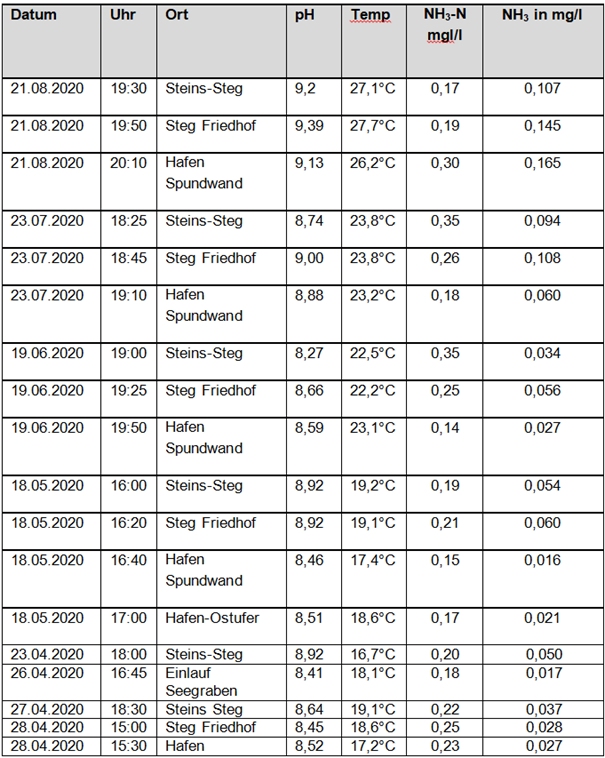 Eigene Messungen des Ammoniakstickstoffs (NH3-N) des Autors werden in folgender Tabelle dokumentiert. Ammoniak (NH3) wird berechnet. Der Zusammenhang ist nicht-linear. Kurzum: Je höher die Temperatur (und/oder des pH-Wertes) desto schlimmer die Folgen für Fisch und Natur. Fast ausnahmslos wird der fischtoxische Grenzwert von Ammoniak gemäß EU-Vorgabe überschritten.