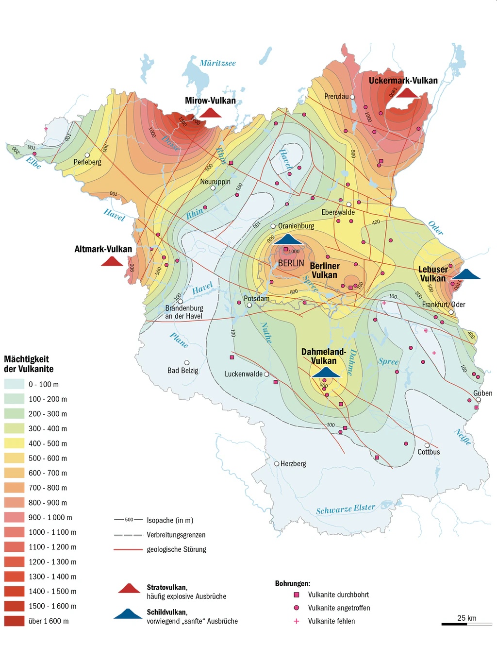 Andererseits verweist er auf einen undatierten Aufschluß bei Dobbrikow, in dem neben Lapilli-Tuff auch magmatische Gesteine wie Olivinbasalte und Granatserpentin angetroffen wurden. NOESKE vermutet den Aufstieg von magmatischem Material mit Begleitvulkanismus entlang einer tektonischen Tiefenbruchzone des Erdmantels. Äußerst fraglich bleibt seine Datierung des "märkischen Vulkanismus" zwischen Saale- und Weichselkaltzeit. Tatsächlich streicht zwischen Luckenwalde und Dobbrikow in nordwestliche Richtung eine geologische Störung. Die Mächtigkeit der Vulkanite beträgt hier 100 m. Bekannte Schildvulkane aus der Perm-Zeit sind der Dahmeland-Vulkan und der Berliner Vulkan.