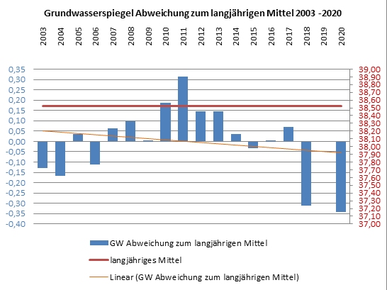 Die mittleren Grundwasserstände schwanken mit +0,34 m (2011) und -0,32 m (2020) um den langjährig mittleren Wert von 38,52 m NHN.