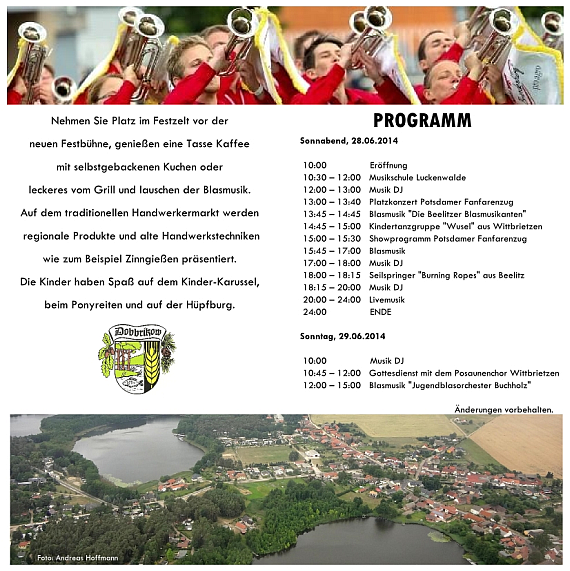 Am Sonnabend spielen die Beelitzer Blasmusikanten. Leider standen bei Drucklegung noch die Lustigen Beelitzer im Flyer. Wir bitten den Fehler zu entschuldigen.