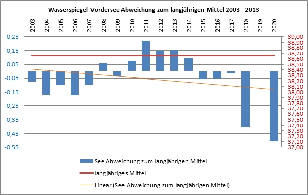 Die mittleren Seewasserstände schwanken mit +0,22 m (2011) und -0,52 m (2020) um den langjährig mittleren Wert von 38,66 m NHN.